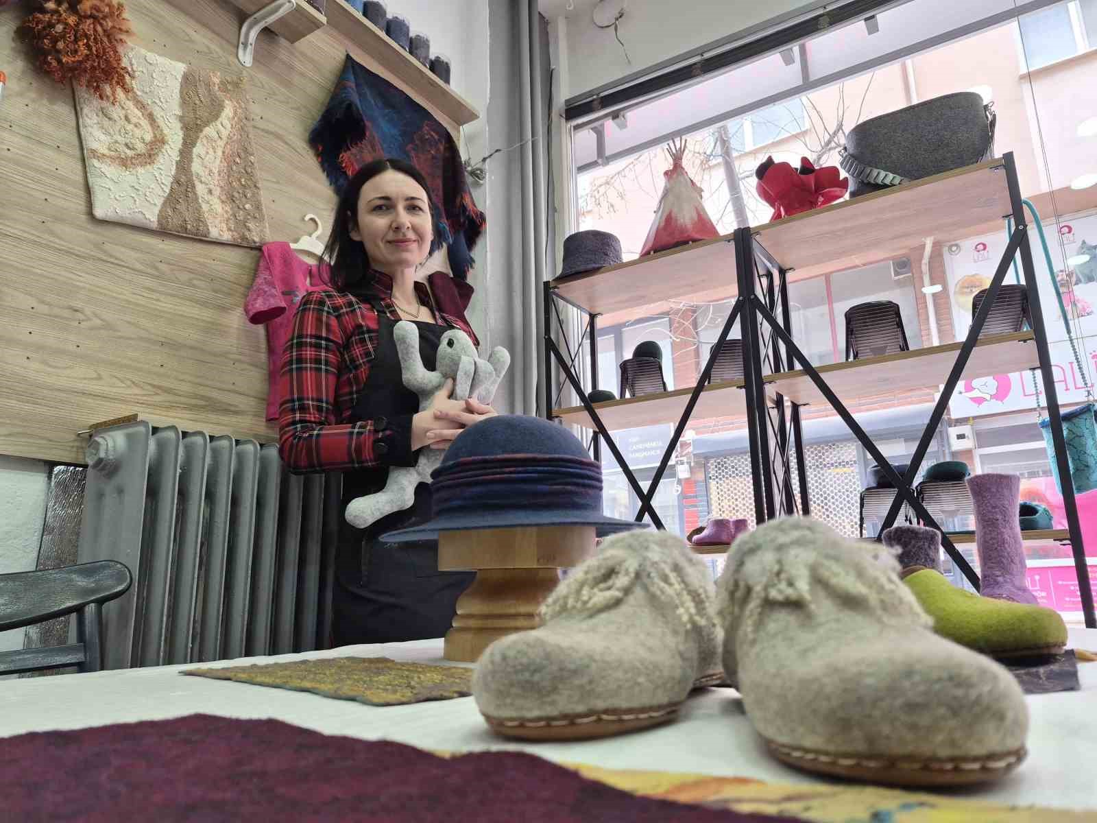 Rusya’dan gelen Natalya Yiğit, kendi ülkesinde öğrendiği keçe ustalığına Eskişehir’de devam ediyor. Bir ürün çıkarmanın çok zor olduğu ve 4 gün ila 1 hafta arasında sürdüğünü belirten Yiğit, günde 8-9 saat arasında çalıştığını aktardı. Ayrıca ürettiği ürünlerin yıllarca kullanılabildiğini anlatan Yiğit, bu ayakkabıların ayak kokusuna ve sağlığına iyi geldiğini söyledi.